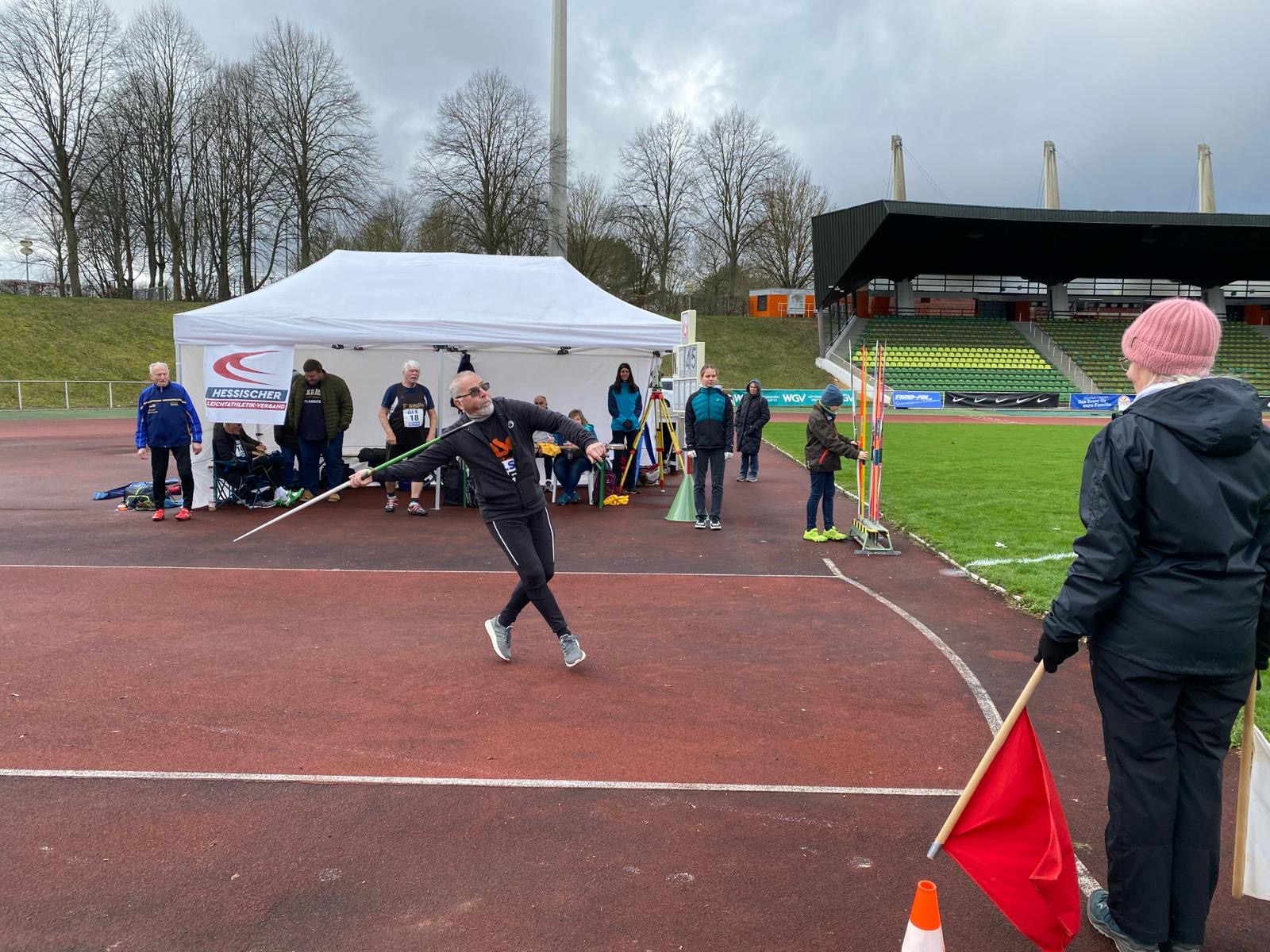 Zeitgleich fanden im hessichen Baunatal die Winterwurf Meisterschaften der Masters statt. Hier waren viele Hessen sehr erfolgreich. Allen voran Ute Mackenroth (W75,RKV Athletics Bebra), die in allen drei Disziplinen am Start war und mit einem Medaillensatz zurück nach Bebra fuhr. Meisterin wurde sie mit 16,80m im Speerwurf, Silber brachten ihr 25,40m im Hammerwurf und 16,31m im Diskuswurf brachten die Bronzemedaille. Gerhard Niemeyer (SSC Vellmar) startete in der M80 und gewann im Hammerwurf mit 27,29m die Bronzemedaille. Im Speerwurf wurde er mit 21,63m den fünften Platz. Die älteste Athletin aus Hessen, Ingrid Schäfer, startete im Hammerwurf und Diskuswurf und wurde jeweils Meisterin mit 20,85m und 13,78m!