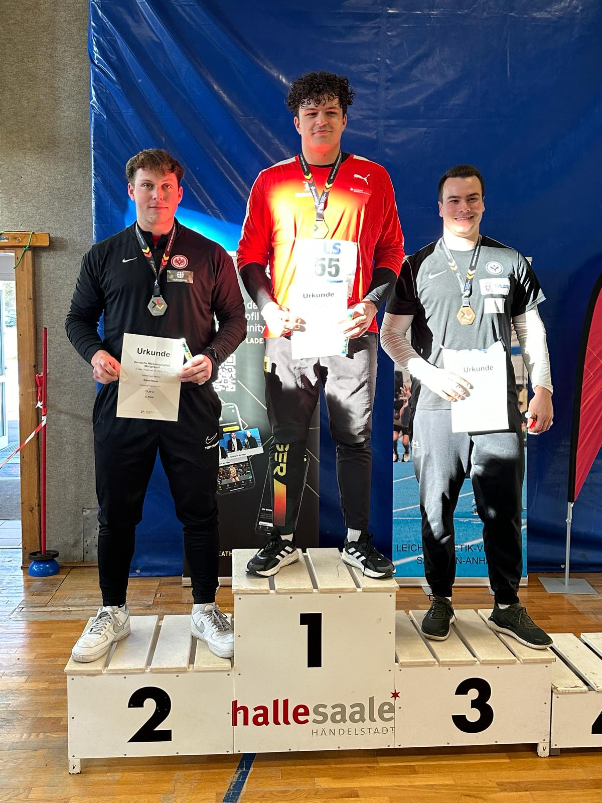 In Halle an der Saale fanden die Winterwurf Meisterschaften der Aktiven und Jugend statt. Erfolgreichster Wettkampf war das Hammerwerfen der Männer am Samstag. Insgesamt vier Hammerwerfer waren unter den Top 8 in Deutschland! Die ersten Medaillen des Wochenendes gingen hier an Sören Klose (Eintracht Frankfurt, Silber) und Christoph Gleixner (Eintracht Frankfurt,Bronze), die mit 73,29m und 65,62m solide Leistungen zeigten. Auf Platz fünf landete Kai Hurych (KSV Fürth) mit 62,67m. Michael Neuenroth (Eintracht Frankfurt) warf mit 56,48m auf Rang Acht. Im Hammerwurf der männlichen Jugend U18 siegte Max Baier (TV Fränkisch-Crumbach) mit zwei Würfen über 71 Meter. In der Endabrechnung standen 71,35m für den Deutschen Meister in der Ergebnisliste.