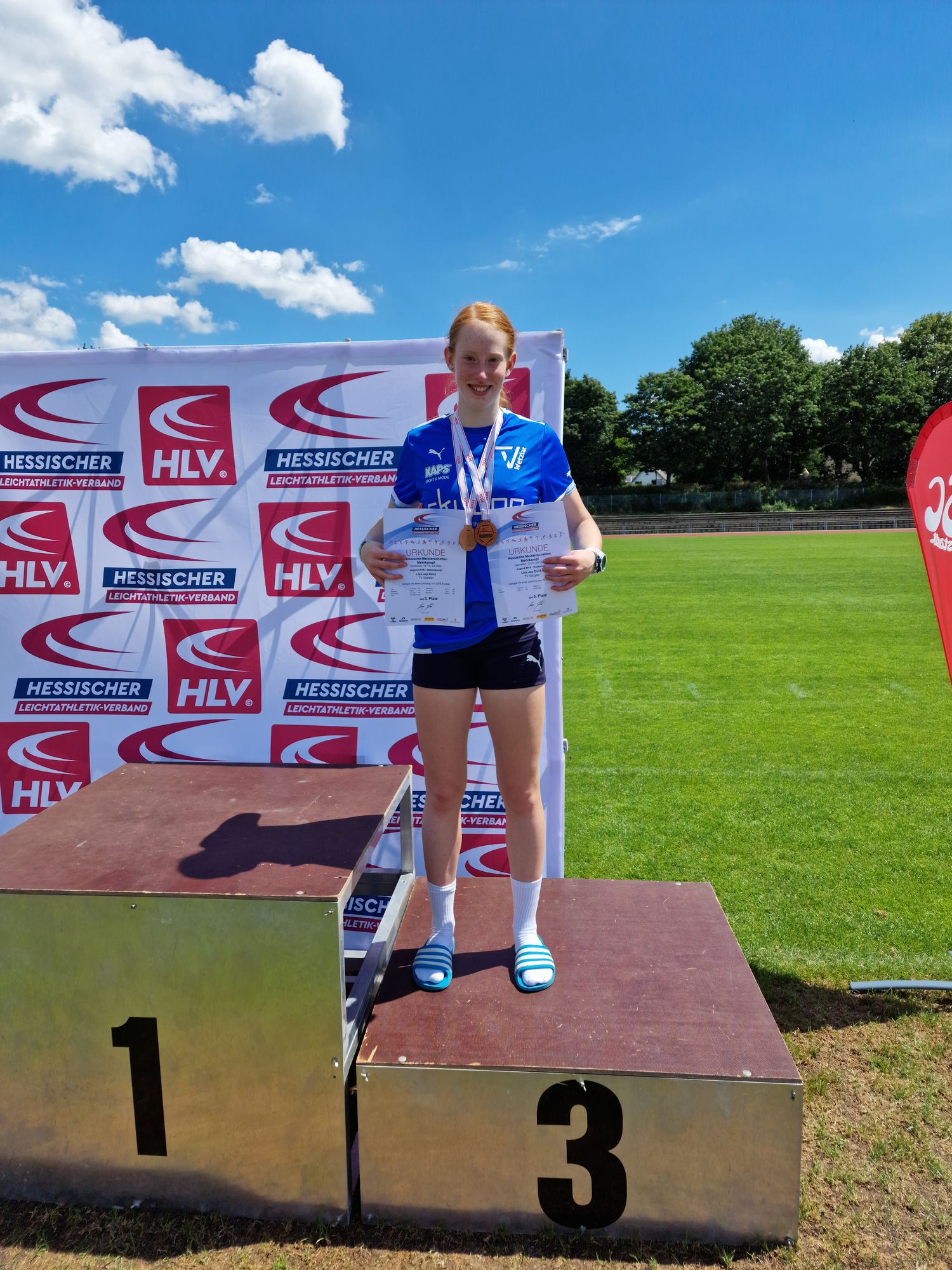 Am ersten Wettkampf (die Vierkampfwertung) sorgte Lisa Dück schon für Nervenkitzel bis zum Schluss. Letztendlich war es der abschließende Hochsprung, in welchem sie über sich hinauswuchs und sich mit sensationellen 1,53m auf Platz drei der Gesamtwertung katapultierte. Lediglich eine der knapp 30 Athletinnen sprang höher. Ihre Zeit über 100 Meter (13,98s) und im Weitsprung (4,45m) lagen auf normalem Niveau, sehr gut ist wiederrum das Kugelstoßen mit 8,90m gewesen. Insgesamt sammelte Dück somit 1.918 Punkte, die Viertplatzierte lag unvorstellbar mit 1.917 Punkten dahinter. An Wettkampftag zwei startete die W15-Athletin mit dem Speerwurf, hier war eine Weite von 26,36m eine ordentliche Mehrkampfweite, auch hier waren nur drei andere Athletinnen vor ihr. Ein wenig Schwung fehlte ihr über die 80 Meter Hürden, wo sie mit 14,11s nicht an ihre Bestleistung herankommt. Vor dem abschließenden 800 Meterlauf lag Dück bereits weiterhin auf Rang drei, die erfolgreiche Verteidigung der Bronzemedaille war das Ziel. Mit einem ordentlichen Finish und 2:47,84min auf zwei Stadionrunden gelang das der 14-jährigen auch und sie hatte ihr zweites Edelmetall in der Tasche! 3.275 Zähler hatte sie final nach sieben Disziplinen auf dem Punktekonto.
